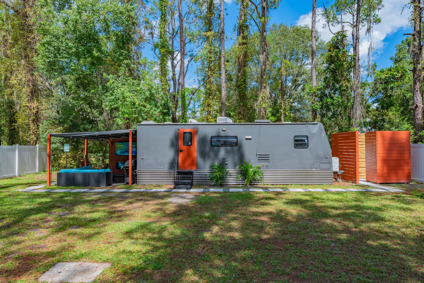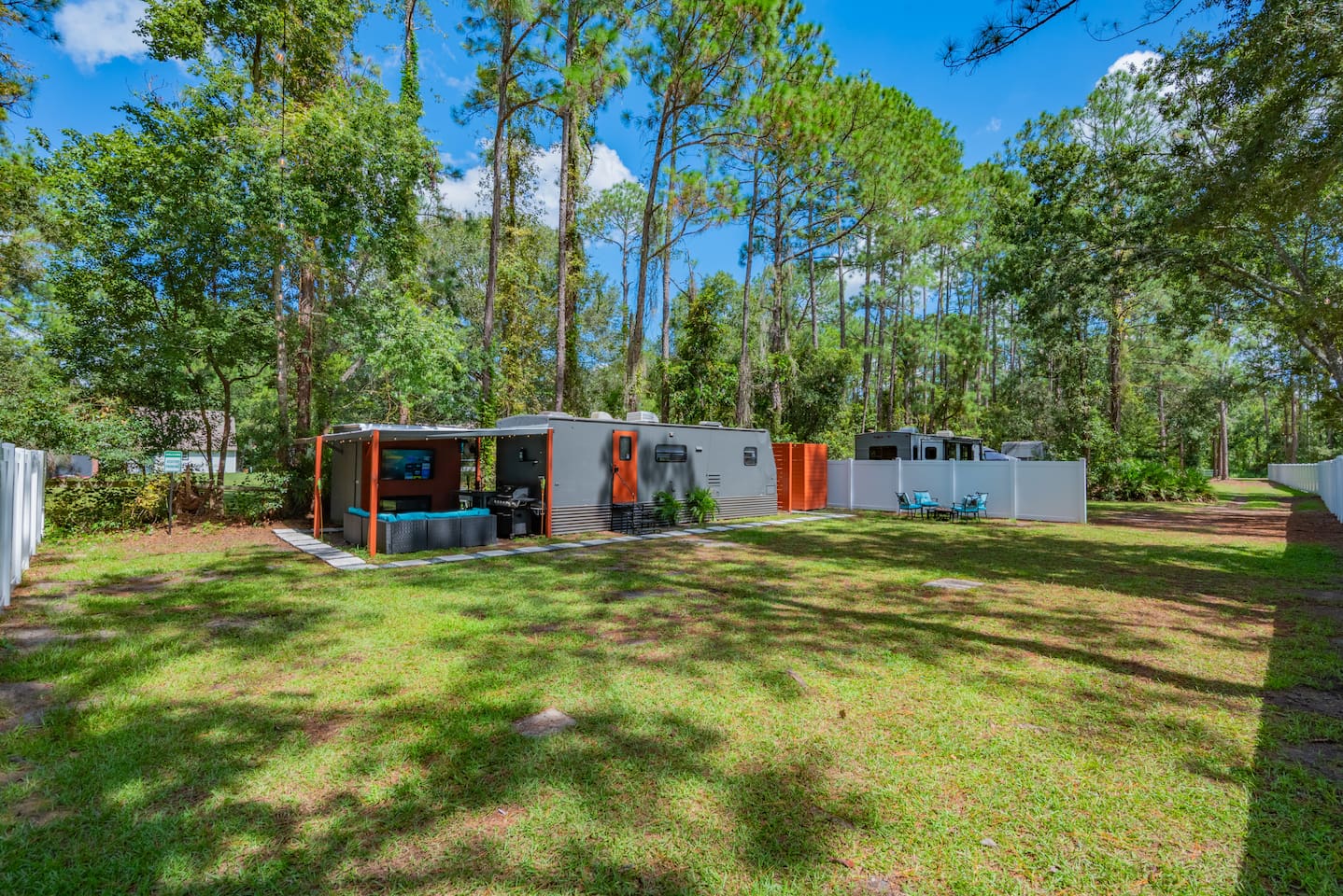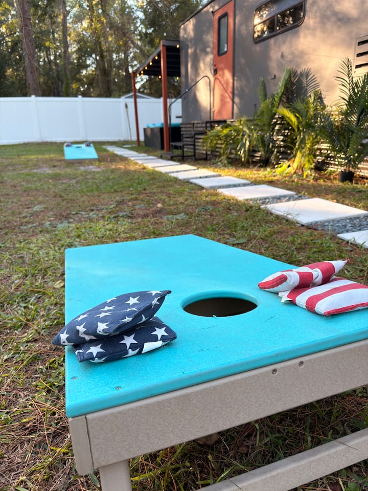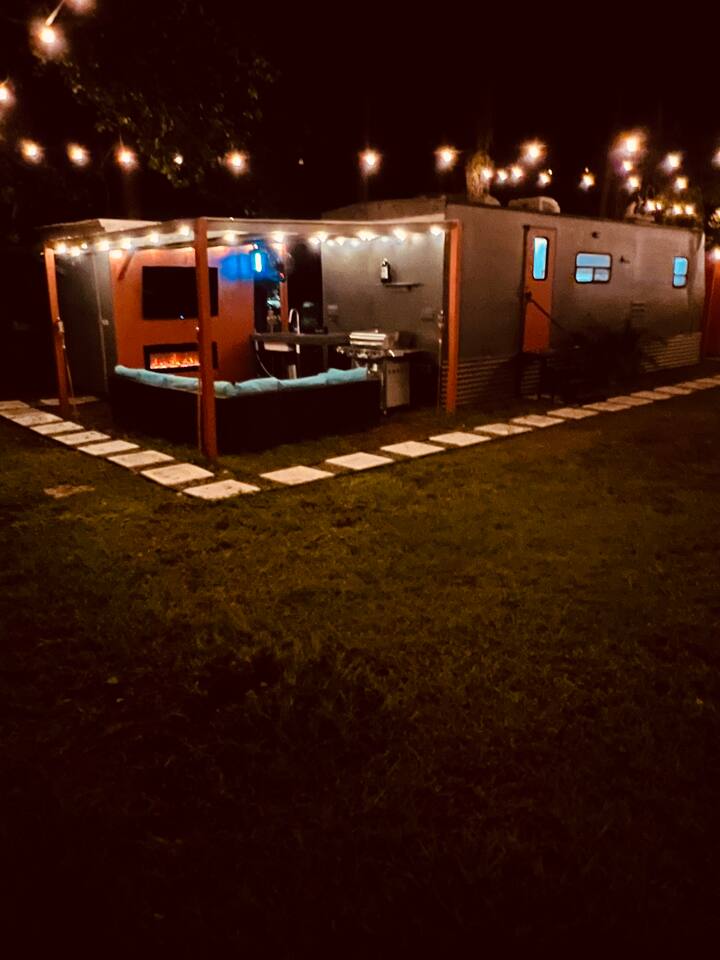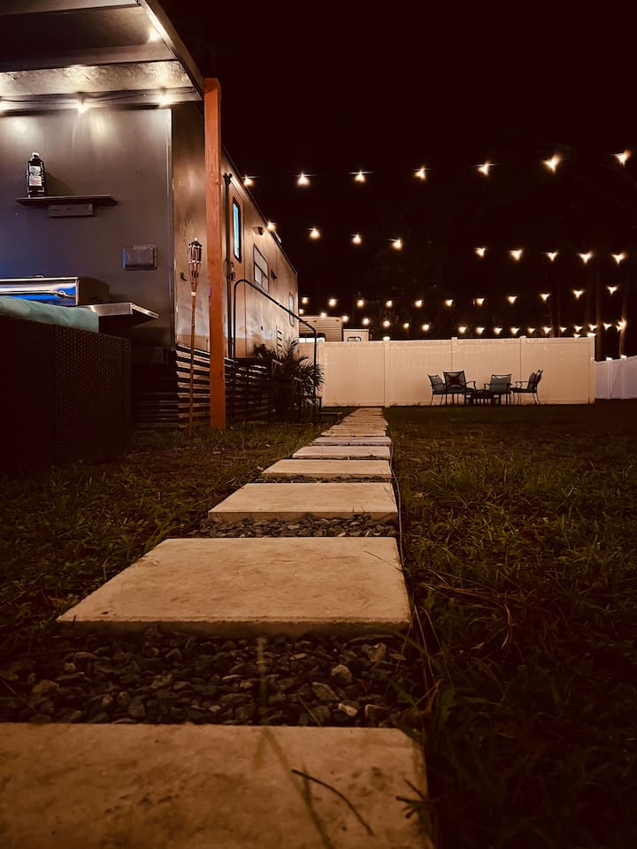 Experience tiny home living with a one-of-a-kind outdoor shower and magical lights that create a dreamlike vibe at night. Just 5 minutes from The Krates and 9 minutes from Epperson Lagoon, this Tropical Getaway RV makes you forget it’s even an RV. Inside, modern comforts and cozy charm await, including a full kitchen and inviting space to relax. Ideal for short getaways or longer stays, this retreat blends nature, comfort, and convenience—your unforgettable Wesley Chapel escape starts here.