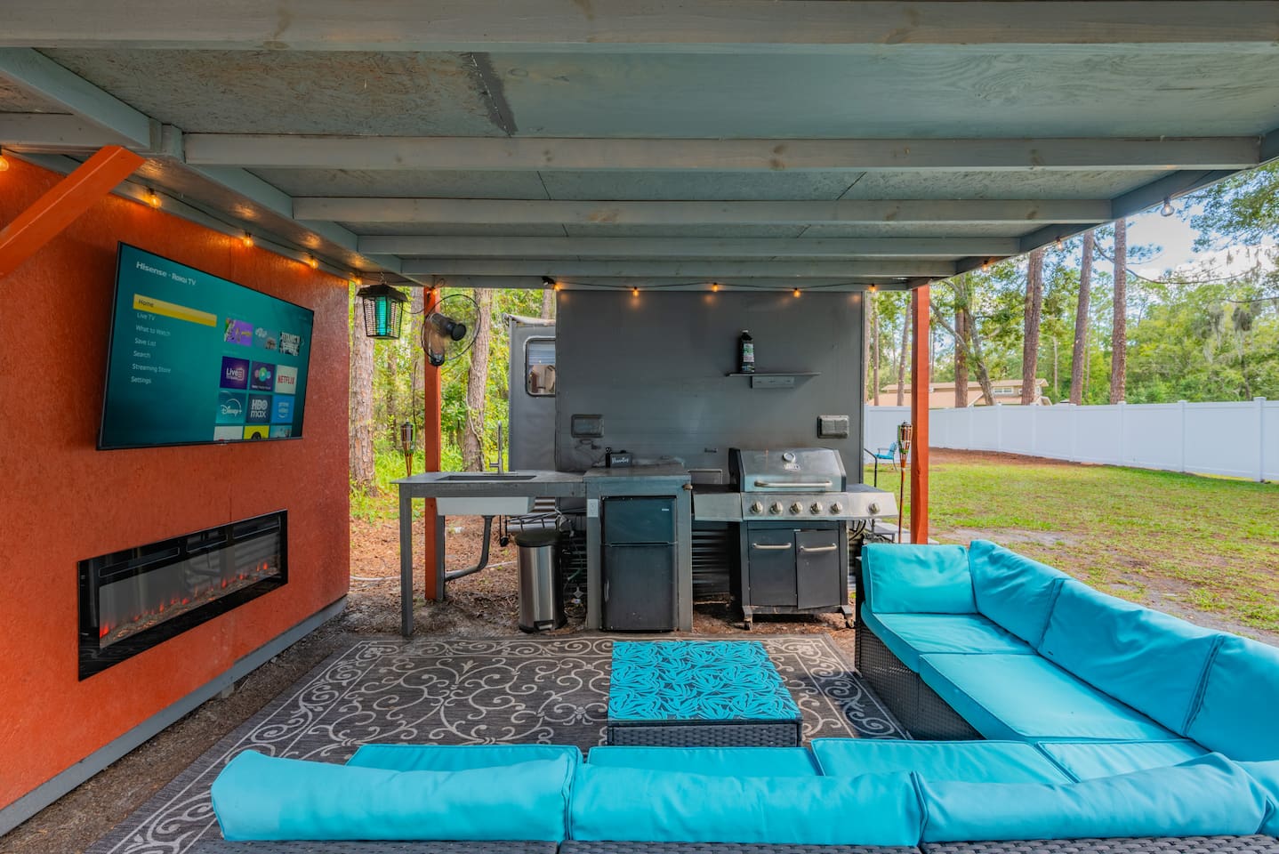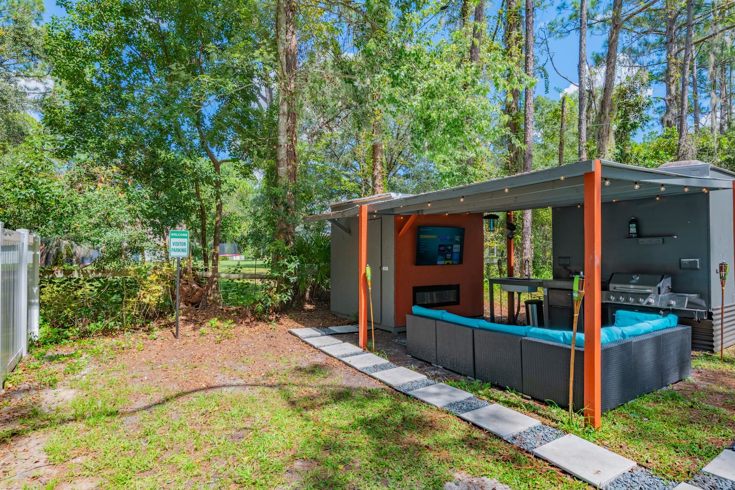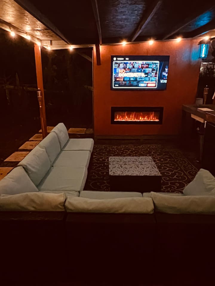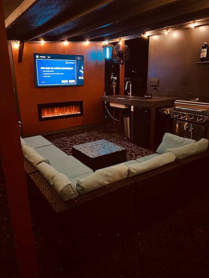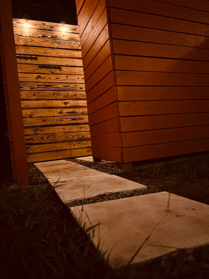 Escape to your own private retreat surrounded by trees, where modern comfort meets a laid-back Florida vibe. This bright, cozy cabin is designed for easy living, whether you're here to relax, explore, or both. Step inside to a thoughtfully designed interior featuring a comfortable sleeping area, a kitchen for light cooking, and a sunny breakfast nook overlooking the outdoors. The living space flows seamlessly to your private covered lounge area, complete with a TV, fireplace, and plenty of seating — perfect for unwinding after a day out. Outside, fire up the grill and enjoy a barbeque in your own tropical setting. Whether it’s a casual cookout or a relaxing evening under the lights, the grill area makes outdoor dining feel extra special. And don’t miss the private outdoor shower, which adds a refreshing, resort-like touch to your stay. You’ll be just minutes away from Epperson Lagoon, Tampa Premium Outlets, The Shops at Wiregrass, and top-rated hospitals like BayCare and AdventHealth Wesley Chapel, giving you the perfect mix of tranquility and convenience. 🌿 A Note About Nature This is Florida living, so don’t be surprised if you cross paths with geckos, palmetto bugs, or the occasional mosquito — they’re part of the tropical landscape.